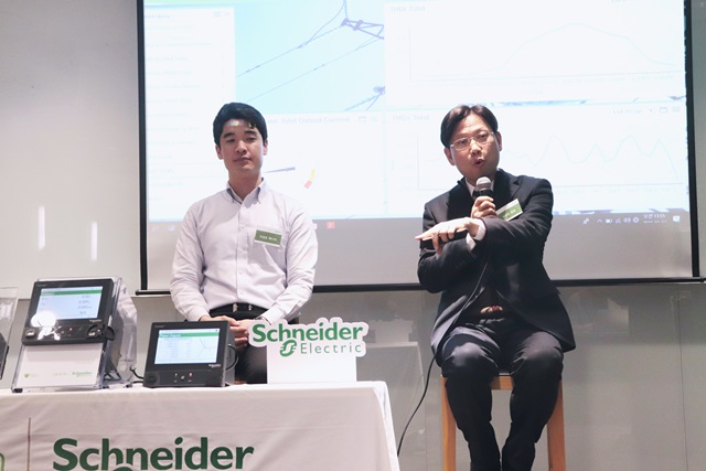 ▲ 슈나이더일렉트릭 관계자가 지능형 전력 관리 솔루션 신제품에 대해 설명하고 있다. (왼쪽부터 이성호 에코빌딩 사업부 매니저, 이호걸 에코빌딩 사업부 팀장)