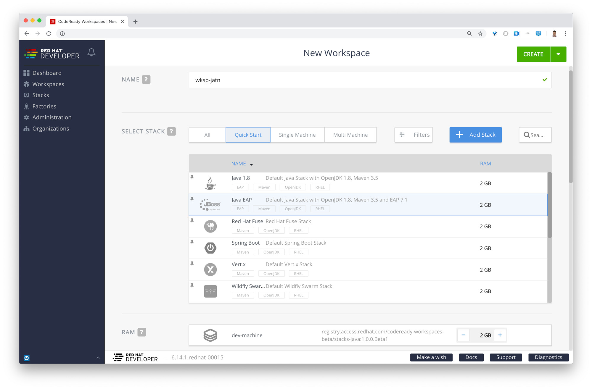 오픈소스 이클립스 체(Eclipse Che) 통합 개발 환경(IDE, Integrated Development Environment) 프로젝트에 기반한 코드레디 워크스페이스는 레드햇 오픈시프트(Red Hat OpenShift) 및 레드햇 엔터프라이즈 리눅스(Red Hat Enterprise Linux)에 최적화됐다.