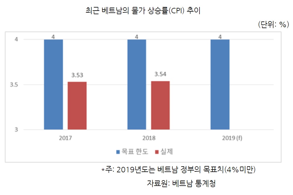 연초, 베트남 정부는 ’19년도 물가 상승률을 4% 이하로 목표 설정했으며, 재정 적자 감소, 주식 시장 안정 등 거시경제 안정화를 위한 위기관리 능력이 향후 중요할 것으로 전망된다.