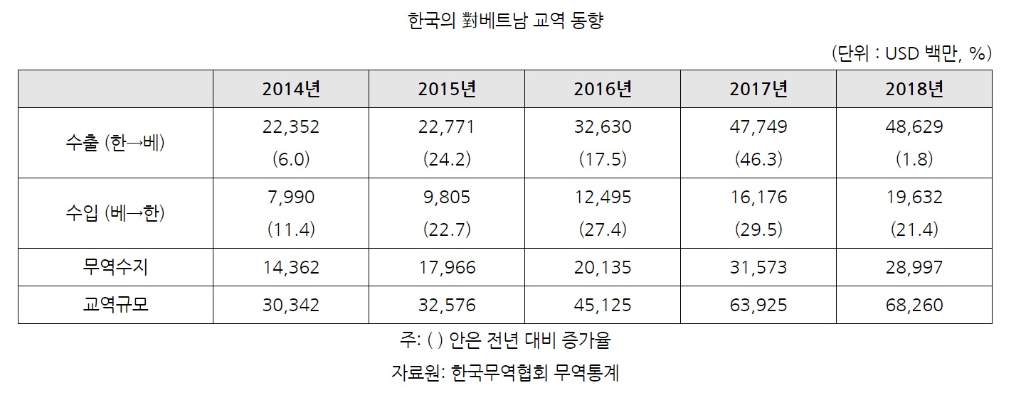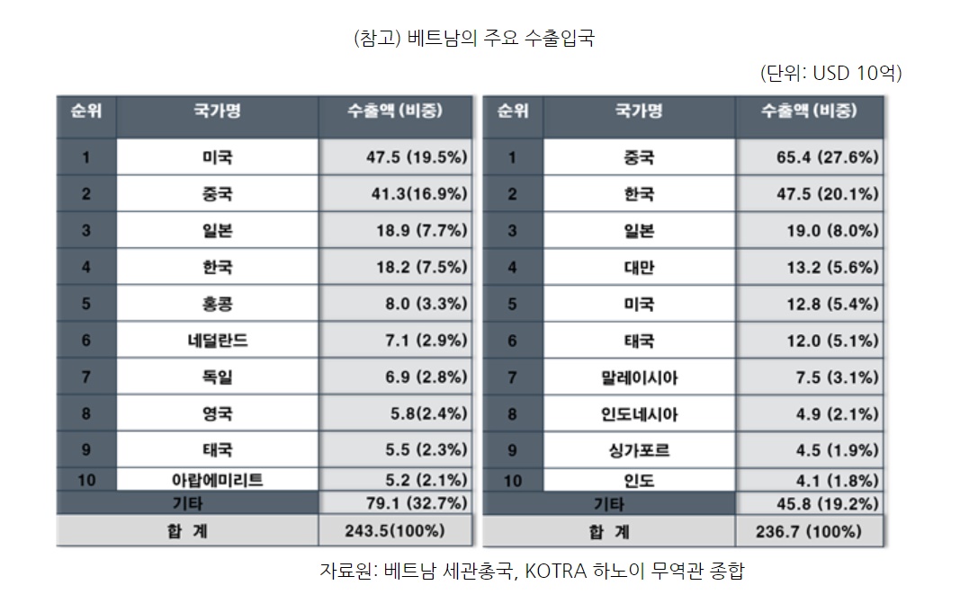 미국과 중국은 각각 베트남 수출대상국 1위, 3위 국가이며, 베트남의 대미국, 대중국 수출비중은 각각 19.4%, 16.6%로 아세안 국가 중 가장 높은 비중을 차지하고 있다.