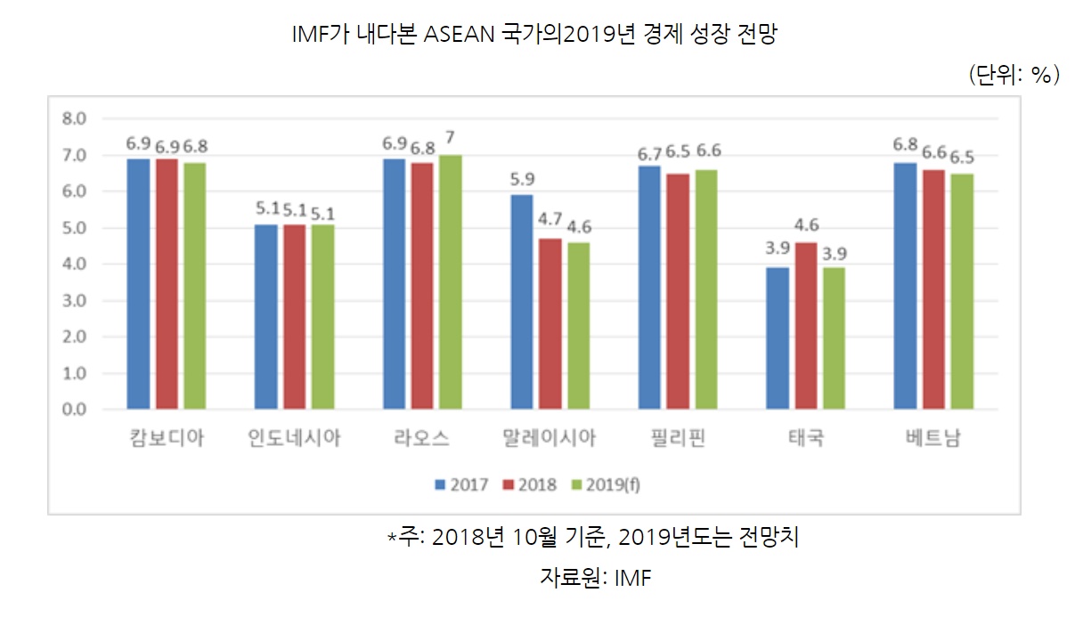 IMF의 ’18년 10월 전망치 기준, 베트남의 ’19년 성장률 전망치는 ASEAN 역내에서 상위권에 속하고 있어서 베트남 경제를 내다보는 외부 시각은 여전히 우호적인 것으로 분석된다.
