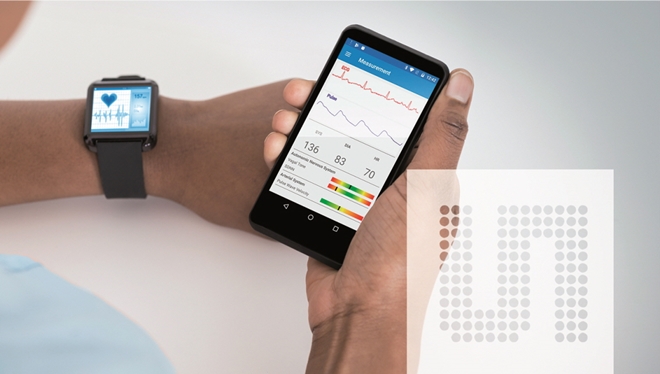소형 광학 센서, 손목밴드, 스마트워치, 기타 모바일 액세서리에서 24시간/7일 내내 심박, 혈압 및 ECG 측정 가능
