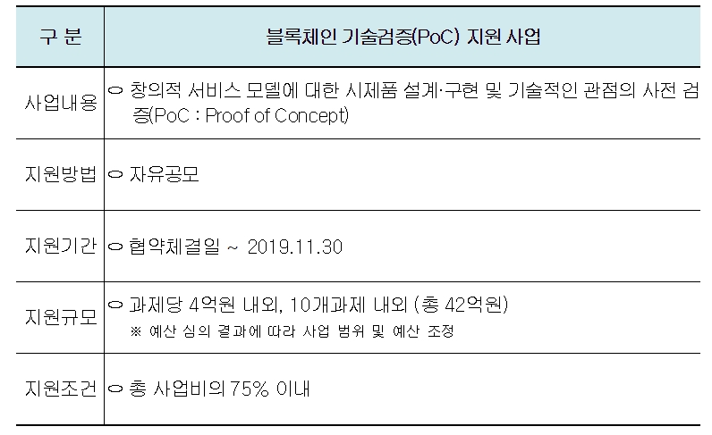 블록체인 기술검증(PoC : Proof of Concept) 지원 사업은 초기 단계에 머물러 있는 블록체인 기반 새로운 비즈니스 모델에 대해 기술 구현 가능성, 성능 검증 등 상용화 가능성을 사전에 검증하는 사업이다.