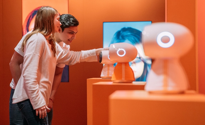 ▲ 사용자의 감정상태를 인지하고 이에 맞춰 기쁨, 슬픔, 평온함, 분노 등을 표정으로 표현해 고객과 감성적 교감이 가능한 LG 클로이 케어봇(LG CLOi CareBot)을 관람하고 있다.