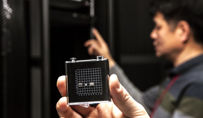 ▲ SK텔레콤 직원이 가입자 인증서버에 적용된 양자난수생성 칩을 들고 있다.
