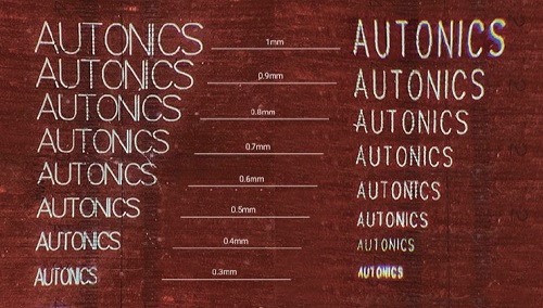 작아질수록 글자가 뭉개지는 것을 확인할 수 있다). UV 레이저 마킹(좌)와 일반 레이저.