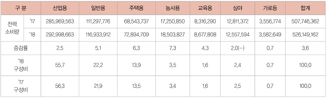지난해 용도별 전력 사용은 지속적인 감소 추세인 심야전력(2.0% 감소)을 제외하고 모든 부문에서 증가했다. 증가율은 농사용은 7.3%, 주택(가정)용은 6.3%, 일반(상업)용은 5.1%, 교육용은 4.3%, 산업용은 2.5%, 가로등은 0.7% 순이었다.