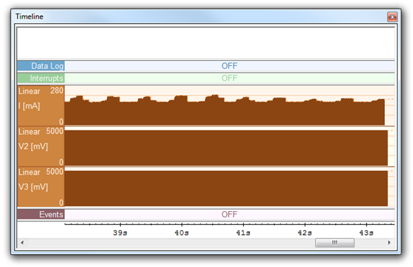 타임라인(Timeline) 창은 응용프로그램의 실행 중 측정되는 값을 시간 경과에 따른 값을 확인 할 수 있도록 그래프화 해 출력하는 창이다. 타임라인 창을 이용하면 응용 프로그램 실행 중 전류 소비의 전반적인 전류소비 양상과 패턴을 한눈에 볼 수 있다. 그래프의 시간 단위 조정이 가능하며 파워 로그 창과 마찬가지로 측정된 샘플을 더블 클릭하면 연관된 실행 코드 위치를 에디터창에 표시한다.