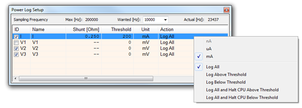파워 로그 셋업(Power Log Setup) 창은 파워 디버깅 사용의 기본 설정을 할 수 있는 창이다. 전류와 전압의 단위 설정, 아이-스코프 장비를 이용 시 연결돼 있는 션트(Shunt) 저장 크기 입력 등의 다양한 연결 정보 설정과 측정되는 전류, 전압 샘플에 따른 액션(Action) 설정이 가능하다.