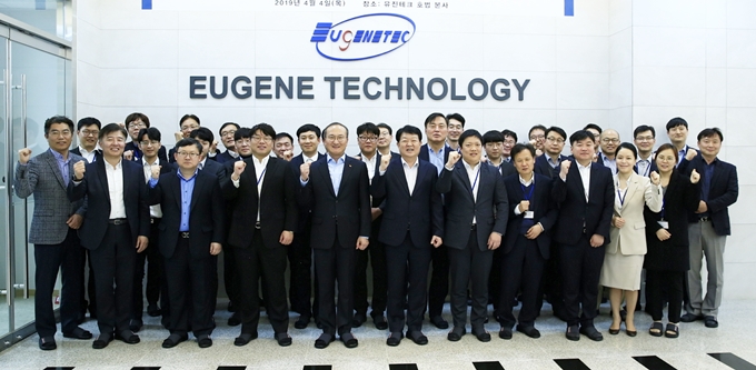 ▲ 유진테크를 방문한 SK하이닉스 이석희 CEO(맨 앞줄 왼쪽에서 다섯번째)가 임직원들과 함께 기념촬영을 하고 있다.