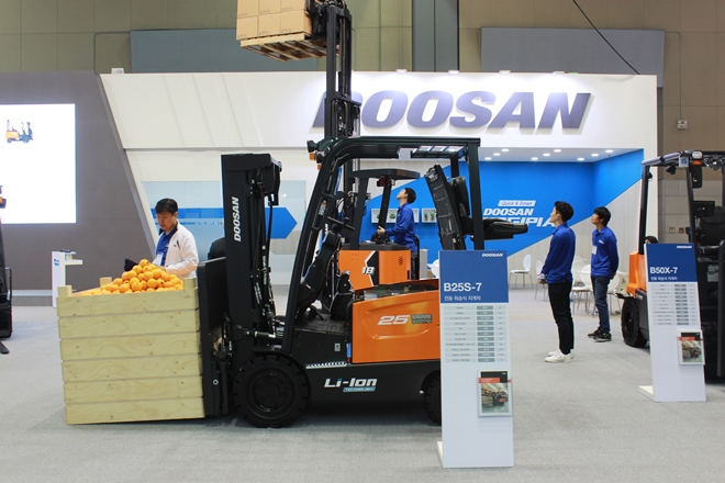 4차산업혁명의 최신기술이 반영된 물류산업의 미래를 가늠할 '국제물류산업대전 2019(KOREA MAT 2019)'가 지난 16일 일산 킨텍스에서 개최됐다. 두산 로지피아는 이번 물류산업대전에서 자사의 지게차와 무인지게차, 파워팔레트 트럭, 두산의 TMS인 'Lin-Q'서비스를 선보였다.
