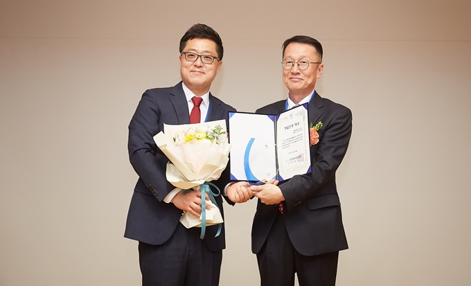 ▲ 에트리홀딩스(주)는 26일, 연구개발특구진흥재단에서 개최된 한국벤처창업학회 춘계학술대회에서 양영석 학회장(사진 좌측)으로부터 창업진흥대상을 수상했다. 조병식 에트홀딩스(주) 대표이사(사진 우측)
