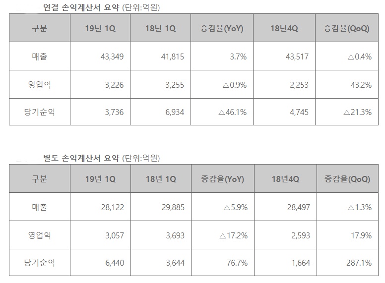 SK텔레콤(SKT)은 7일, 연결 재무제표 기준으로 2019년 1분기에 매출 4조 3천 349억원, 영업이익 3천 226억원, 순이익 3천736억원의 실적을 기록했다고 밝혔다.