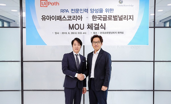 RPA기업 유아이패스코리아가 IT 전문 교육기관인 한국글로벌널리지와 RPA 전문가 양성 프로그램을 위한 업무협약(MOU)을 체결했다.