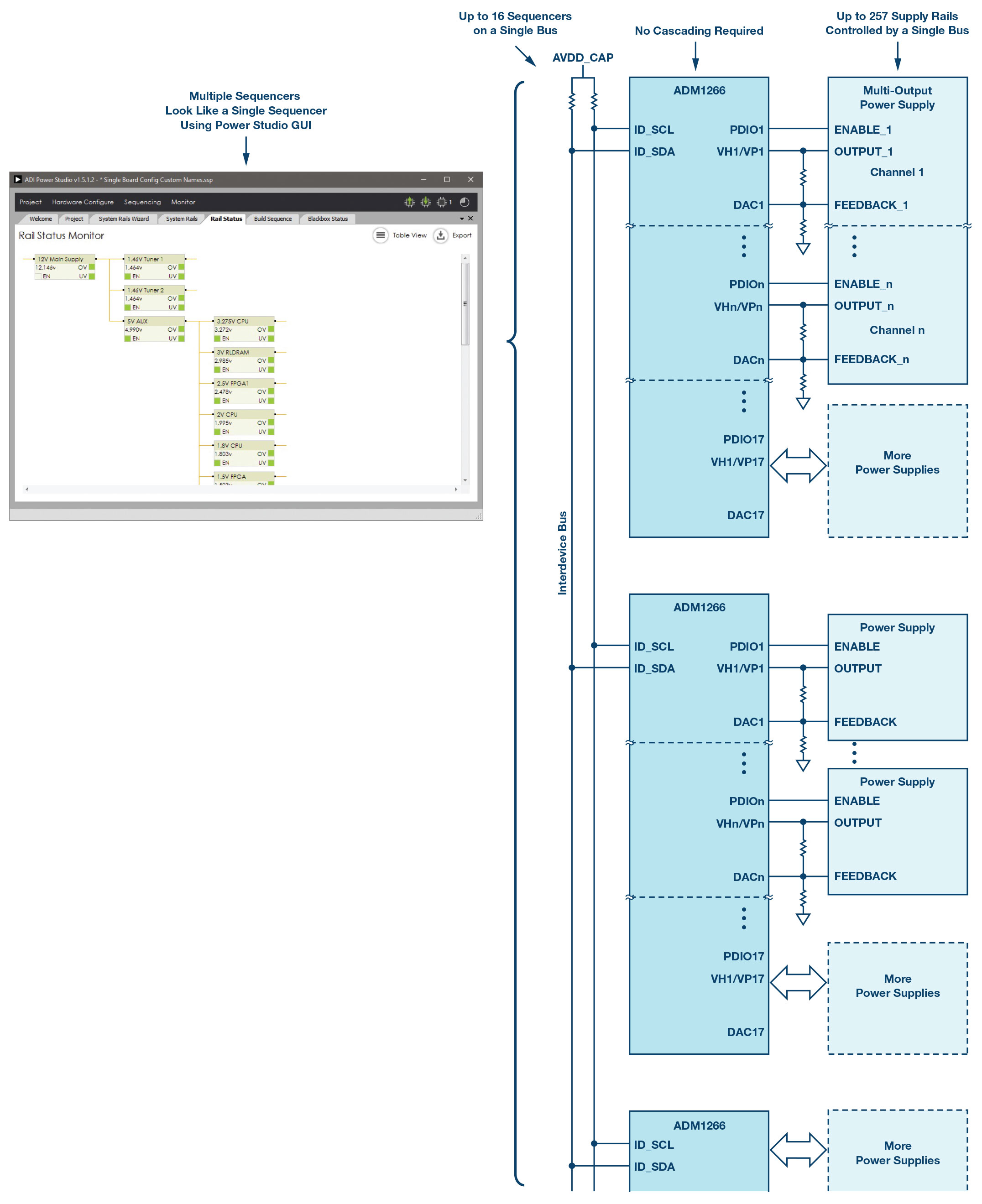ADM1266은 하나의 마스터를 사용하며, 추가적인 ADM1266 디바이스들은 슬레이브가 된다. 또 IDB로 연결된 모든 개별 ADM1266은 동시에 다음 단계로 넘어가는 병렬 아키텍처를 사용함으로써, 시스템 조건에 따라서 버스 상의 모든 ADM1266들은 동기화한다. 버스 통신은 투명하게 이루어지므로, 설계자 측면에서는 1개의 ADM1266을 위한 시퀀스를 생성하는 것이나 16개 ADM1266 디바이스를 위한 시퀀스를 생성하는 것이나, 작업에 들어가는 시간이나 노력이 똑같아진다.