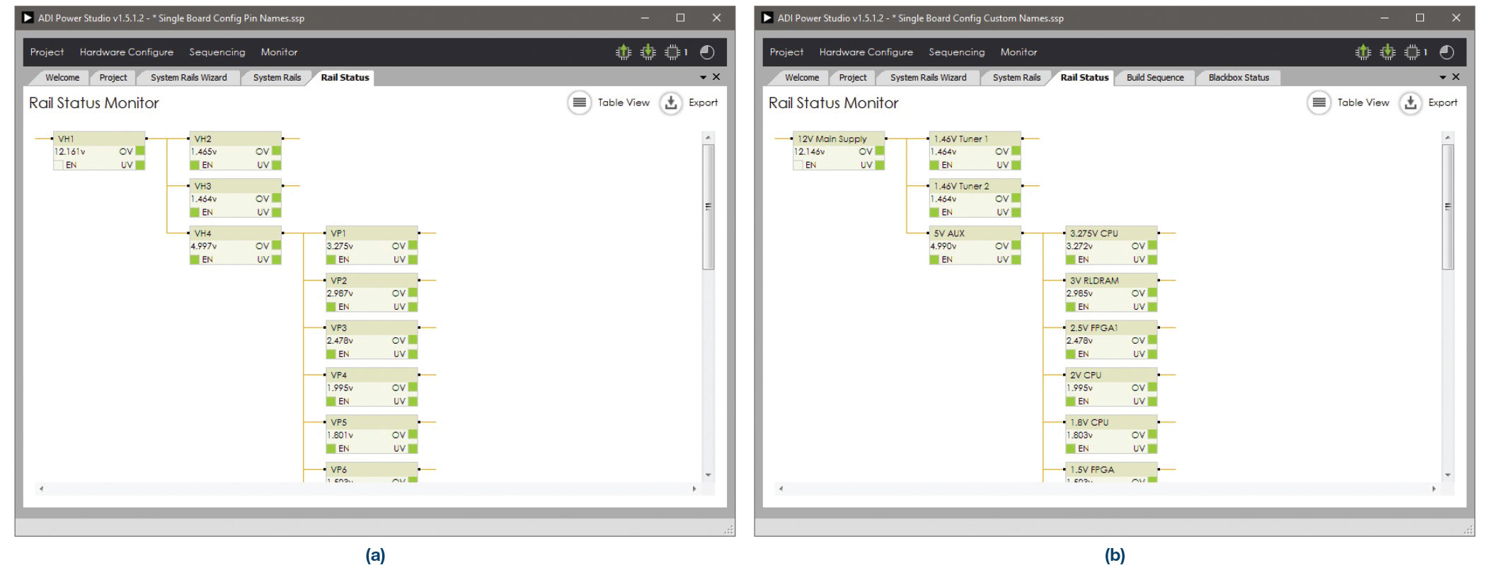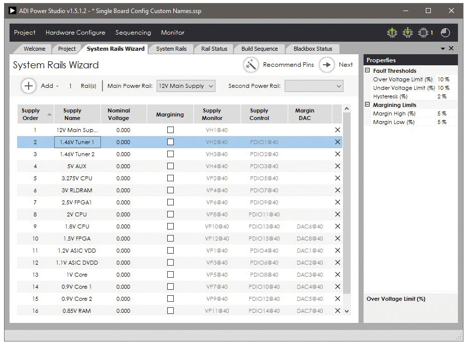 ADM1266은 이와 다른 접근법을 취하고 있다. PC 기반 개발 툴인 ADI Power Studio™를 사용하면 이 디바이스의 구성 및 디버깅이 가능하다. 이 툴은 ADM1266의 다양한 설정을 구성하는 것뿐만 아니라 훨씬 많은 것들을 할 수 있다. ADI Power Studio는 포괄적인 개발 및 디버깅 툴로서, 설계자가 견고한 시퀀스를 달성할 수 있도록 돕는다. 설계자는 기존 GUI를 활용할 때보다 더 상위 레벨에서 전원 시스템에 접근할 수 있다. 이 툴의 마법사 기능을 사용하면 80개 전압 레일을 단 몇 분만에 셋업 및 구성할 수 있다. 이 작업을 수작업으로 하려고 하면 적어도 몇 시간은 걸릴 것이다. 그림 2와 그림 3은 이 툴의 인터페이스 화면을 보여준다.