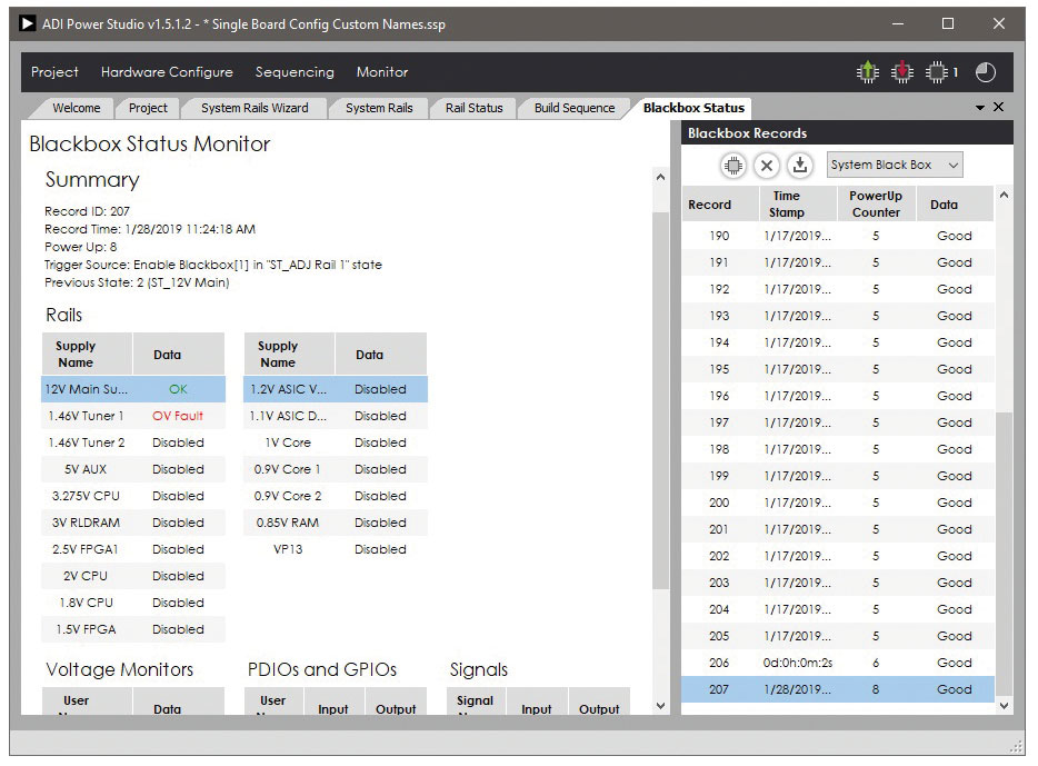 또 다른 디버깅 툴은 블랙박스 기록 기능이다. 이는 특정한 이벤트가 발생했을 때의 모든 전압 모니터링 및 디지털 핀 상태를 사진을 찍듯이 기록하는 것이다. 블랙박스 기능이 작동하면, 이벤트가 발생했을 때의 상태, 이벤트 발생 전의 양호한 상태, 이벤트 발생 시각, 파워업을 한 횟수, 결함 발생 횟수 같은 정보들을 기록한다. 따라서 설계자는 문제가 어디에서 발생했는지 찾아내서 신속히 원인을 진단할 수 있다.
