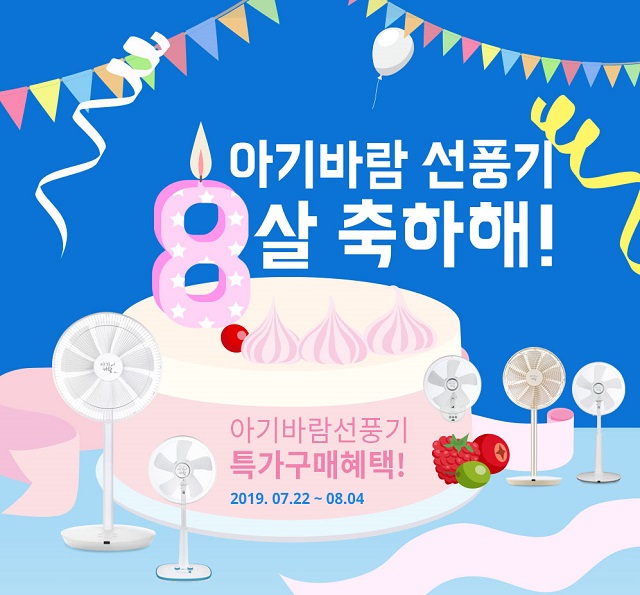 ‘아기바람 선풍기 8살 축하해’를 컨셉으로 진행되는 이번 행사는 7월 22일부터 8월 4일까지 14일간 한일전기 온라인몰 마이한일에서 진행되며, 행사 기간에 아기바람 선풍기를 최대 45% 할인된 가격에 구매할 수 있다.