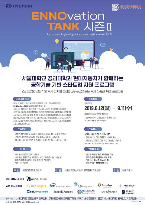 ‘ENNOvation TANK(이하 에노탱크)’는 청년 일자리 창출과 기술 생태계 활성화를 위해 서울대학교 공과대학이 주최하고 현대자동차가 후원하는 공학기술 기반 스타트업 지원 프로그램이다.