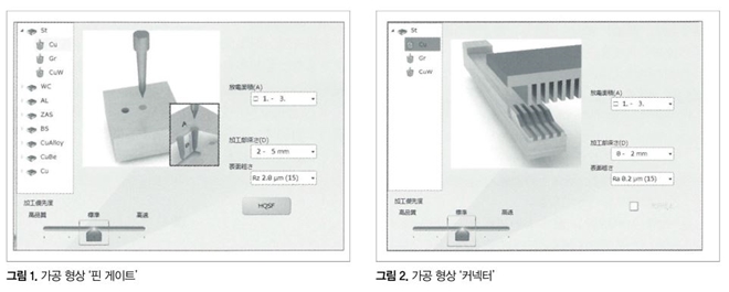 다음으로 화면 상에서 선택할 수 있는 가공 형상의 일부를 소개한다. 그림 1, 그림 2에 나타냈듯이 핀 게이트, 커넥터 등의 가공 형상이 미리 준비되어 있다. 화면 중앙에 실제 형상을 이미지한 화상이 표시되기 때문에 어떤 형상에 적합한지를 한눈에 이해할 수 있다. 여기에 Hyper i를 사용해 실제로 가공한 사례를 소개한다.