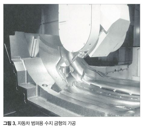 익스텐션 헤드와 분할 5축 헤드를 사용, 자동차 범퍼용 수지 금형의 가공 샘플을 제작했다(그림 3). 이와 같은 금형은 사이즈가 크고, 복잡한 형상이기 때문에 가공 시간은 수백 시간에 미친다. 가공 부위에 따라서는 공구 각도를 변경해 어프로치할 필요가 있기 때문에 분할 5축 헤드가 필요하게 된다.