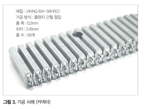 이하에 실제 가공 예를 나타냈다. 그림 3에 나타냈듯이 폭 0.3mm의 스트레이트 홈을 깊이 1.5mm로 59개, 단면 7시간을 소요해 가공한 힘든 테스트이다.