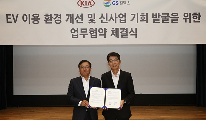기아자동차㈜와 GS칼텍스㈜는 지난 29일 서울시 강남구 GS 타워에서 기아자동차 국내사업본부장 권혁호 부사장, GS칼텍스 소매영업본부장 장인영 부사장 등 행사 관계자 20여 명이 참석한 가운데 ‘전기차 이용 환경 개선 및 신사업 기회 발굴을 위한 업무협약(MOU)’을 체결했다.