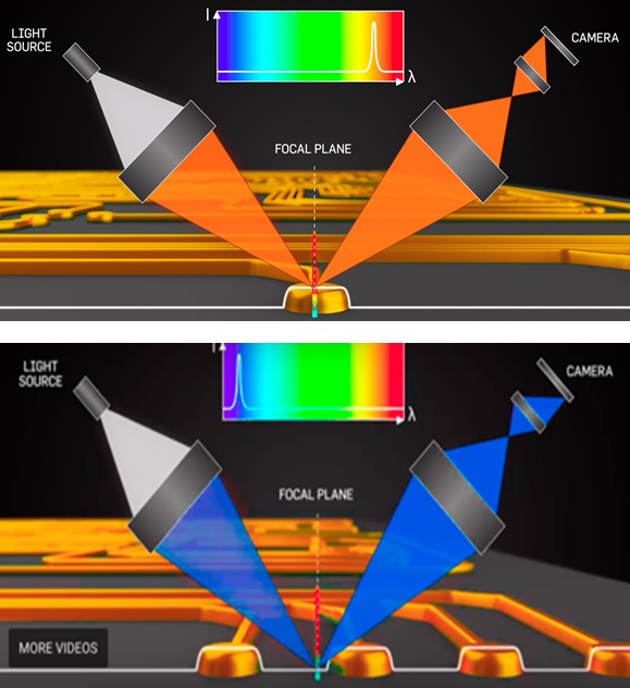 FocalSpec LCI 센서는 축외에 설치한 측면 색수차 공초점 스캔을 기반으로 한 고유의 광학 방식을 이용하여 초당 데이터 지점 최대 2700만 개의 샘플링 속도와 측정 재현성 70nm으로 3D 지형도(표면 배열), 2D 인텐시티(표면 명암), 3D 단층 촬영(투명 표면 아래 여러 층 스캔) 등을 동시에 캡처한다.