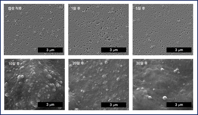 ▲실온 보관 시 시간의 변화에 따른 키토산 나노입자의 변화를 전자현미경으로 촬영한 사진, 특정 구조로 형성되어 있던 키토산 나노입자가 30일 후 분해된 것을 볼 수 있다. <사진 : 한국기계연구원>