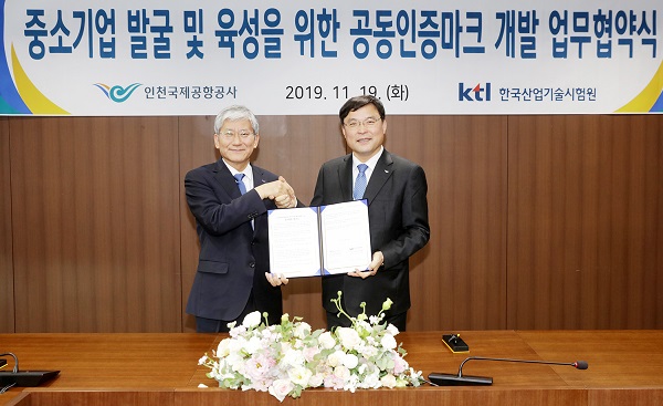 ▲11월 19일, KTL과 인천국제공항공사가 항공산업 중소벤처기업 지원 및 육성을 위한 업무협력 협약을 체결했다. 왼쪽부터 KTL 정동희 원장, 인천국제공항공사 구본환 사장