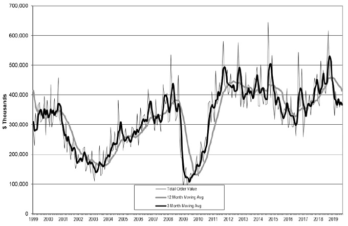 ▼ 2019년 8월 미국 공작기계 수주 현황 (Total U.S. Manufacturing Technology Orders Through August 2019)