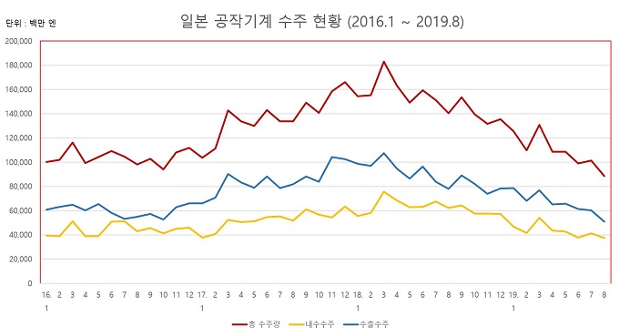 2019년 8월 공작기계 수주량은 884.9억 엔으로 전월대비 12.6% 감소했다. 2개월만에 다시 감소세로 돌아섰다. 전년동월과 비교해서도 37.0% 감소했다. 전년동월 기준으로 11개월 연속 하락세다. 2013년 4월 이후 76개월 만에 처음으로 900억 달러 선이 무너졌다.