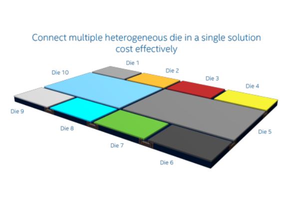 인텔의 EMIB(Embedded Multi-Die Interconnect bridge)는 서로 다른 공정과 아키텍처 기반 칩 통합을 위한 기술로, 쌀 한 톨보다 작은 복합 다층 실리콘 조각이다. 칩 사이를 연결해 CPU, 그래픽, 메모리, IO 등 복수의 칩이 통신할 수 있도록 지원한다. 인텔의 혁신적인 기술인 EMIB를 통해 엄청난 양의 데이터는 초당 몇 기가 바이트 수준의 초고속으로 인접한 칩들 사이를 이동할 수 있게 됐다.