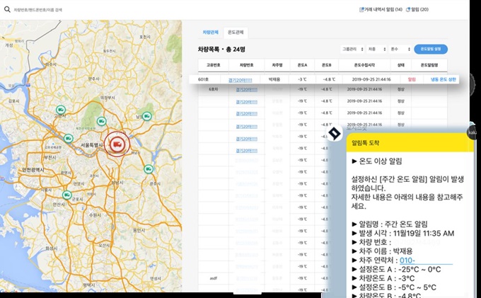 디지털 운송 플랫폼에서 등록차량의 위치와 온도를 실시간으로 파악하면서 관제를 하며, 플랫폼 상에서 제한온도의 범위를 설정할 수 있고, 설정된 제한온도를 벗어나면 등록된 수신인들에게 실시간으로 카카오톡을 통해 알림을 전송한다.