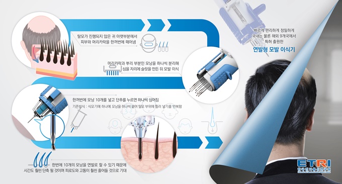 한국전자통신연구원(ETRI)가 경북대학교 모발이식센터, 오대금속과 공동연구를 통해 모낭을 연속으로 심을 수 있는 연발형 모발이식기를 개발했다. 기존 모발이식기와 사용법이 동일해 적응하기 쉽고 수술 시간을 30~50% 이상 대폭 낮출 수 있어 환자와 의사의 부담을 줄이는데 큰 도움이 될 전망이다.