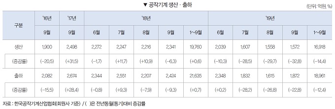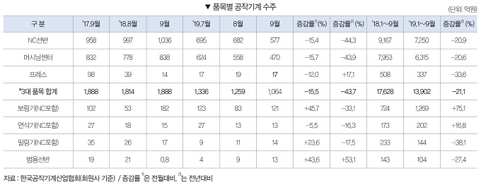 2019년 1~9월 공작기계 수주는 1조7694억원으로 전년동기대비 20.3% 감소했다. 내수수주는 8033억원으로 전년동기대비 20.3% 감소하였으며, 수출수주 또한 9931억원으로 전년동기대비 20.4% 감소했다.