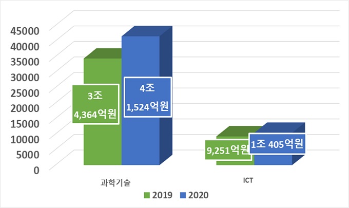 ▲2020년 ICT, 과학기술 정부 투자가 전년 대비 상승했다.