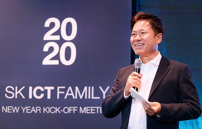 ▲ SK텔레콤 박정호 사장이 2일 SK텔레콤 을지로 본사에서 열린 ‘2020년 SK ICT 패밀리 신년회’에서 신년 메시지를 발표하고 있다.