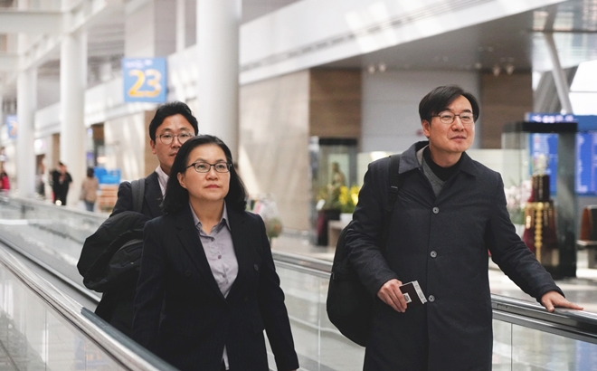 ▲유명희 통상교섭본부장(왼쪽)이 다보스 포럼에 참석하기 위해 출국 수속을 밟고 있다. (사진 : 산업통상자원부)
