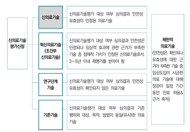 보건의료연구원에서는 기존급여여부 확인 결과 요양급여 대상 또는 비급여대상이 아닌 의료기술의 안전성·유효성을 평가한다. 평가 결과는 분야별 전문평가위원회 및 신의료기술평가위원회에서 해당 기술의 안전성·유효성을 평가해 평가결과를 장관이 고시할 예정이다.