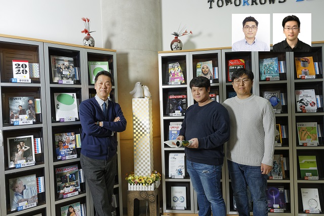 ▲ (좌측부터) 곽상규 교수, 김진철 연구원, 전우철 연구원 (위쪽) 강석주 교수, 안광진 교수. <사진 : UNIST>