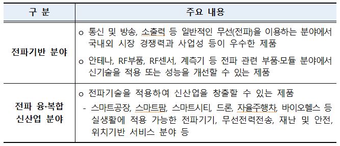 이번 사업은 초연결·지능화 시대의 핵심자원인 전파의 활용이 방송·통신산업 이외의 다양한 혁신·융합 분야로 확장되는 추세를 반영하여, 창의적인 아이디어 및 우수 기술력을 보유한 국내 중소기업을 대상으로 전파기반, 전파 융·복합 신산업 분야의 제품화 제작을 지원한다.