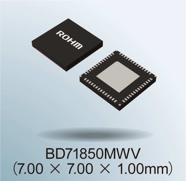 로옴의 BD71850MWV는 지금까지 로옴이 축적해온 프로세서용 전원 기술을 구사해 프로세서에 필요한 전원 계통 (파워 레일)과 기능을 집적한 PMIC다. 최고 전력 변환 효율 95%의 고효율 DC/DC 컨버터를 비롯하여 시스템에 필요한 전원 및 보호 기능을 싱글칩으로 공급함과 동시에, 최적의 전원 관리를 실행하는 ON / OFF 시퀀서를 내장해 소형화뿐만 아니라 애플리케이션 설계를 용이하게 함으로써 개발 기간의 대폭적인 단축에 기여한다. 또한, NXP사가 제공하는 i.MX 8M Nano 프로세서의 평가 Kit에 탑재된 유일한 PMIC로서, 프로세서에 대한 동작을 신속하게 평가할 수 있다(2020년 1월 기준).