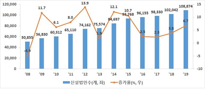 중소벤처기업부(이하 중기부)가 2월 10일 발표한 신설법인 동향에 따르면 2019년 신설법인은 전년 대비 6.7%(6832개) 증가한 10만8874개로 역대 최고치를 기록했다. 2009년 이후 11년 연속 증가했다.
