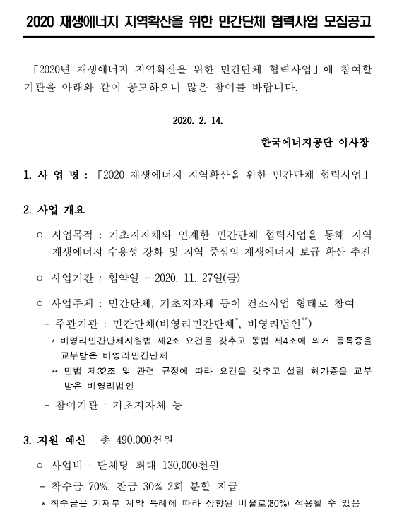 한국에너지공단(이사장 김창섭)은 14일(금)부터 오는 28일(금)까지 2020년 재생에너지 지역 확산을 위한 민간단체 협력사업 공모를 진행한다고 밝혔다.