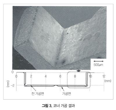 2차원적인 장방형 슬롯 형상의 2군데 코너에 대해, 교대로 펄스 인가와 스탬프에 의한 플러싱을 반복함으로써 양호한 진직도를 갖는 코너 가공을 달성했다. 가공 결과를 그림 3에 나타냈다. 또한 전극 끝단면 전체에 미세 구조를 가진 공구 전극을 이용하는 전사가공도 가능하다. 가공 결과를 그림 4에 나타냈다.
