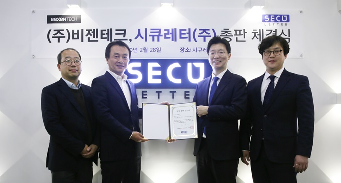 ▲ 시큐레터가 비젠테크와 총판계약을 체결한 후 기념촬영을 하고 있다. 사진 왼쪽부터 정종석 비젠테크 이사, 김완호 비젠테크 대표, 임차성 시큐레터 대표, 송치훈 시큐레터 본부장이 서 있다.
