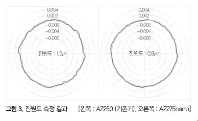 고가속도의 운동 성능을 평가하는데 있어, Ø3.0, 높이 4mm의 소경 원기둥 가공을 했다. 가공은 AZ250(동사 기존기) 및 AZ275nano로 각각 하고, 가공 프로그램은 동일하게 해 최대 가속도를 AZ250에서는 0.2G, AZ275nano에서는 0.5G로 했다. 각각의 기계에서 가공한 원기둥의 진원도 측정 결과를 그림 3에, 가공 시간의 비교를 표에 나타냈다.