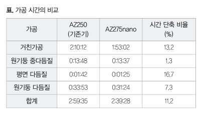 또한 최대 가속도의 설정을 높게 하고 있기 때문에 AZ275nano에서는 각 공정 모두에서 가공 시간이 단축됐으며, 토털 가공 시간은 AZ250과 비교해 11% 단축됐다. 미세 정밀 가공 영역에서는 CAM에서 산출되는 가공 시간과 실제 가공 시간이 대폭으로 다른 경우가 있다. 그것은 축의 가감속 시간을 CAM에서는 고려하고 있지 않기 때문이다.