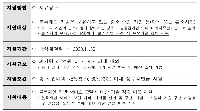 이 사업은 블록체인 전문기업들이 분야에 제한 없이 창의적인 아이디어를 제안하는 자유공모로 총 9개 내외를 선정하고 과제당 4.5억 원 이내, 총 39억 원을 지원할 계획이다.